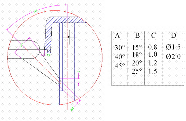 適用于大部塑料、各種側邊允許澆口痕跡的制品,開在制品的邊緣或邊緣頂面,又分標準入水、搭接入水和扇形入水,下圖中t為產品壁厚,L一般為(0.8—1mm)